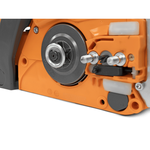 Доступ к натяжному винту обеспечивается сбоку через крышку цепной звёздочки. Это предотвращает контакт рук с острой цепью и кончиками зубчатого упора.