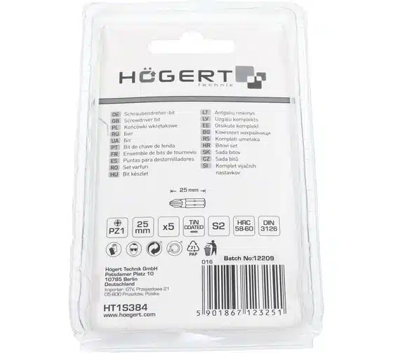 Биты (5 шт; PZ1; 25 мм; сталь S2 TiN) HOEGERT TECHNIK HT1S384 предназначены для работы с шуруповертами. Подходят для больших нагрузок и непрерывной работы.
