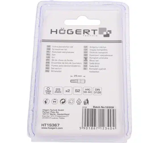 Биты (2 шт; TORX 40; 25 мм; сталь S2) HOEGERT TECHNIK HT1S367 предназначены для работы с шуруповертами. Подходят для больших нагрузок и непрерывной работы.