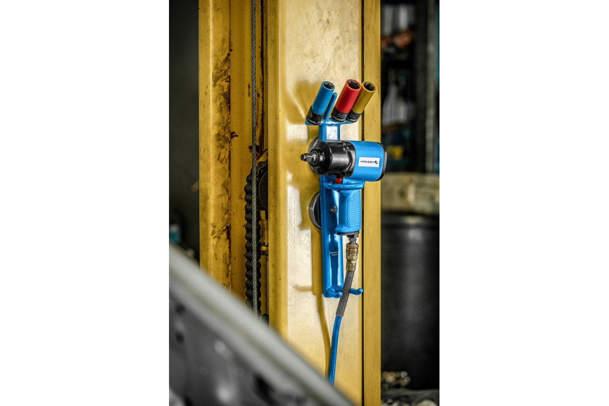 Профессиональный магнитный держатель для инструментов в мастерских. Крепится двумя мощными магнитами к любой металлической поверхности, например, к инструментальной панели, шкафу для инструментов. Часто используется в шиномонтажных мастерских на колоннах гидравлических подъёмников, сверление которых запрещено. Держатель позволяет содержать рабочее место в чистоте и безопасно хранить ударные гайковерты и головки. Эффективно решает проблему хранения дорогостоящих ударных гайковертов и головок, не допуская их хранение на полу и предотвращая их возможное повреждение. Кронштейн может быть закреплен непосредственно на колонне подъёмника, без необходимости сверления в нем отверстий (что не соответствует нормам UDT). Гайковерт можно расположить рядом с рабочим местом, улучшая его эргономику и сводя к минимуму время для доступа к инструменту, находящемуся за пределами вытянутой руки.